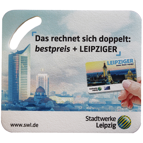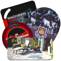 Mindestmenge ab 106 Stück Duckverfahren Sublimationsdruck Schaumstoffdicke 1cm, 2cm Schaumstofffarben creme weiss, schwarz Format eckig, rund, Sonderform Größe 30x34cm, 39,5x19,5 Besonderheit Rückseite auch bedruckbar, optimal für Fotomotive/Full-Colour-Motive Lieferzeit max. 3 Wochen