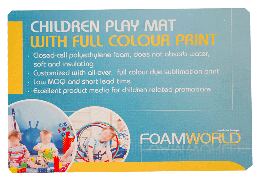 Bestehend aus geschlossenzelligem, wasserabweisenden PE Schaum. Sitzkissen kann vollflächig im Sublimationsverfahren bedruckt werden. Geringe Mindestmenge und schnell lieferbar. Die Play Mat ist ein toller Werbeträger für die Zielgruppe Kinder.