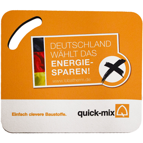 Mindestmenge ab 40 Stück Duckverfahren ohne Druck Schaumstoffdicke 1,6cm oder 3cm Schaumstofffarben auf Anfrage Format eckig Größe 30x35cm Besonderheit kleine Mindestmenge, kurzfristig lieferbar Lieferzeit max. 3 Werktage